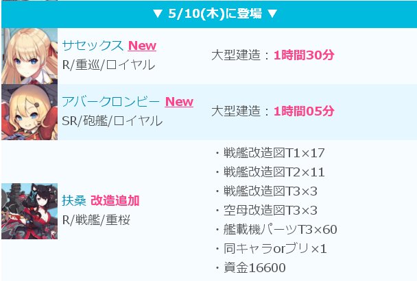 アズレン究極攻略db アズールレーン 新キャラの建造時間 サセックス 1時間30分 アバークロンビー 1時間5分 扶桑の必要改造図 戦艦改造図t1 17 戦艦改造図t2 11 戦艦改造図t3 3 空母改造図t3 3 艦載機パーツt3 60 同キャラorブリ 1